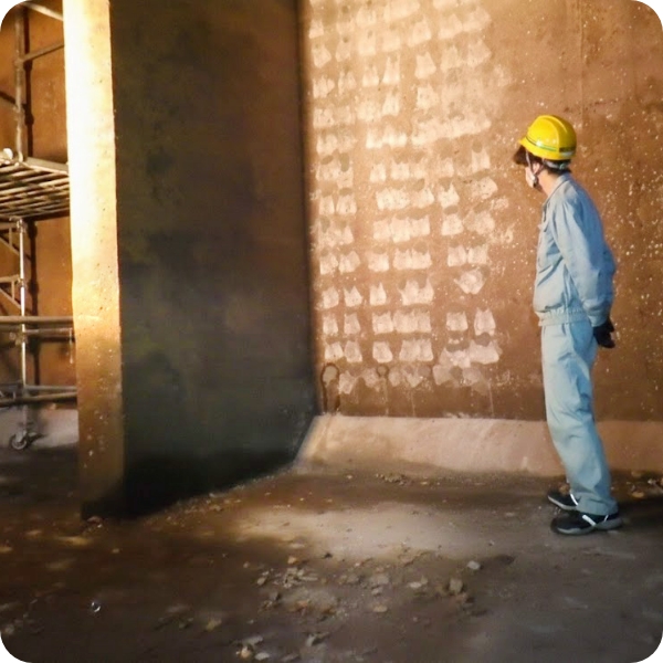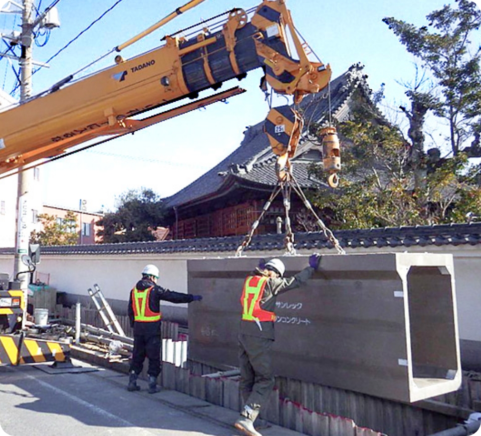 大雨時の内水氾濫を防ぐため河川に設置しているポンプ所の耐震補強工事など、重要な公共インフラの耐震補強工事を行っています。
