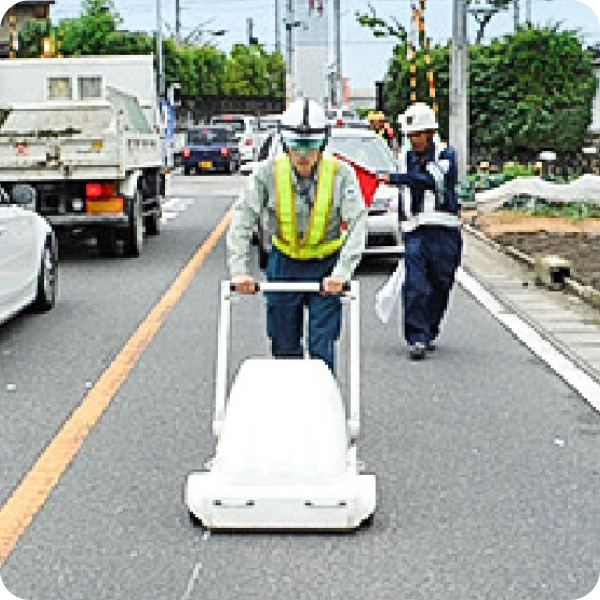 レーダー探査機による調査を行います。空洞が発見された場合は流動化処理土を充填することによって道路の陥没を未然に防ぎます。
