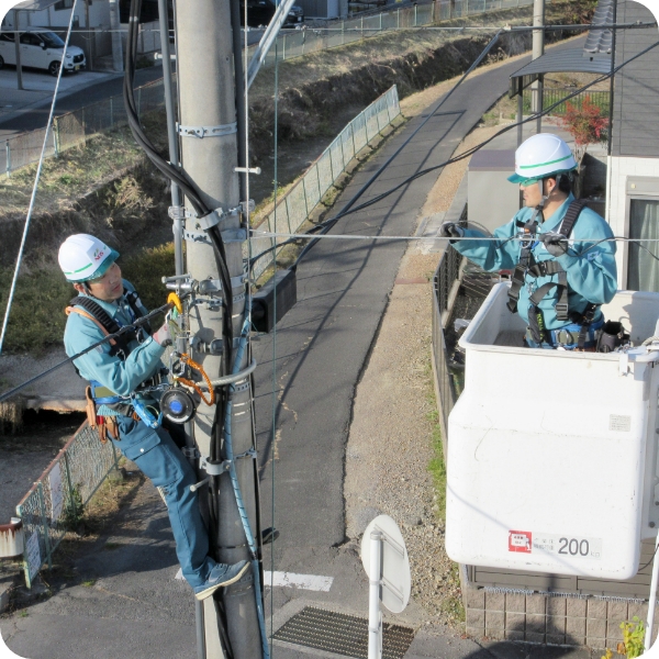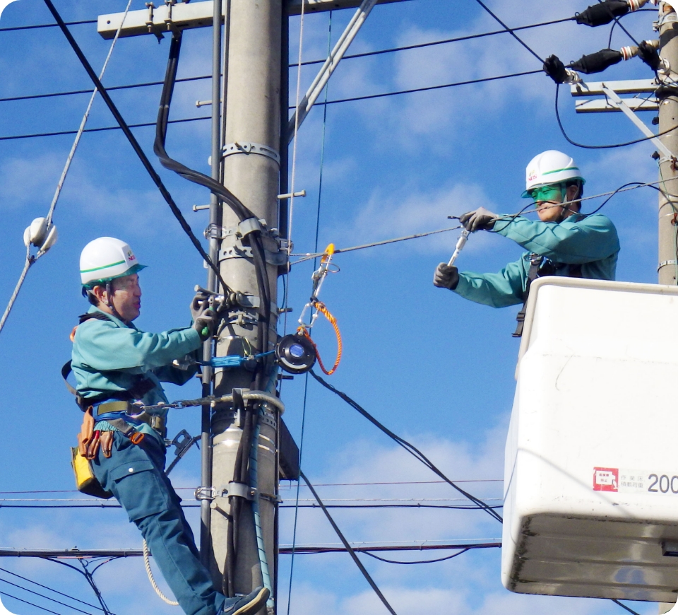 高所作業車などを活用して、電柱の移設など、お客様の要望に応じ、安心・安全を最優先で緊急対応を実施しています。